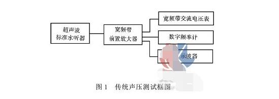 盡管存在著種種困難,但生產(chǎn)實(shí)踐特別是科學(xué)研究中又迫切需要測(cè)量超聲波清洗機(jī)超聲波聲壓及聲場(chǎng)狀況。在研究領(lǐng)域,一般用多臺(tái)儀表組合的方法實(shí)施對(duì)聲場(chǎng)的測(cè)量,它的測(cè)試框圖如圖1所示: